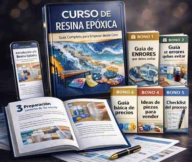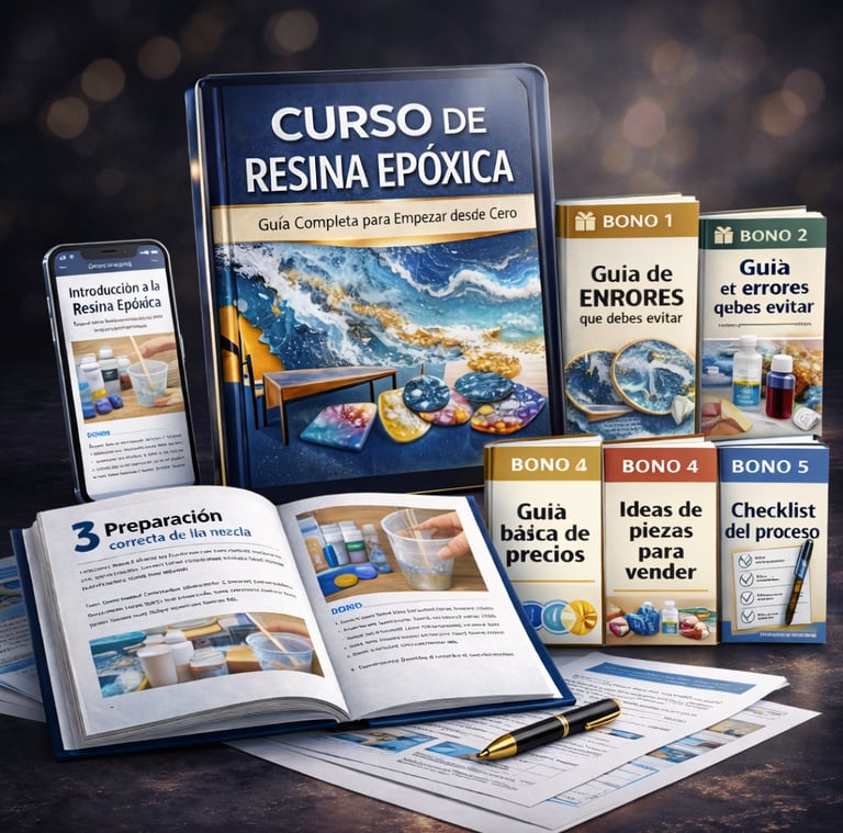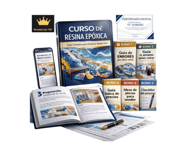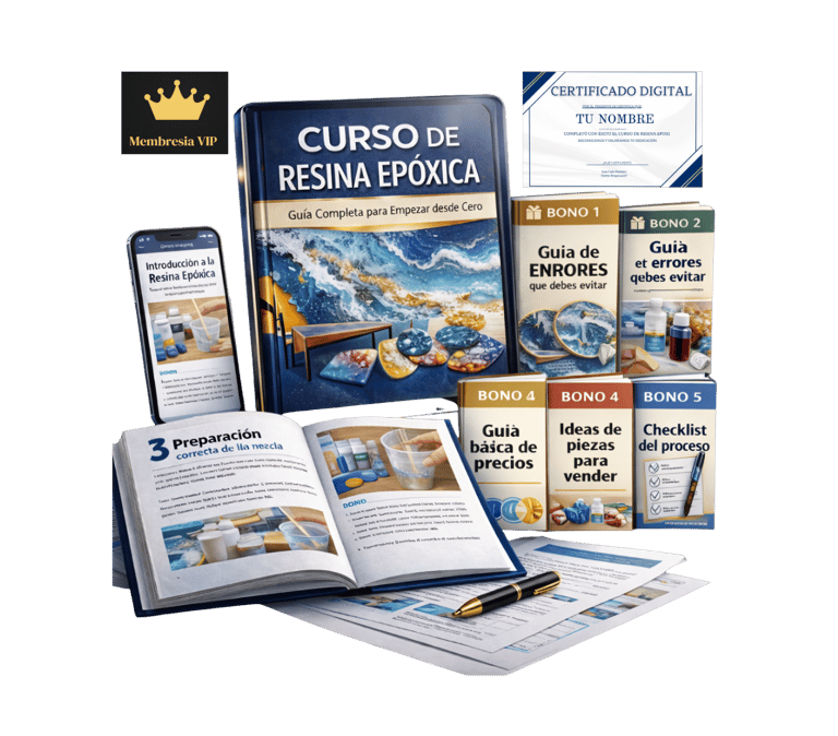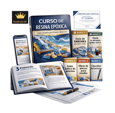 Recibirás el curso completo de Resina Epóxica desde cero, junto con 5 bonos especiales que te ayudarán a elegir materiales, evitar errores, encontrar ideas de piezas para vender, calcular precios y seguir el proceso con más seguridad, todo en formato digital para acceder desde tu celular, tablet o computador.