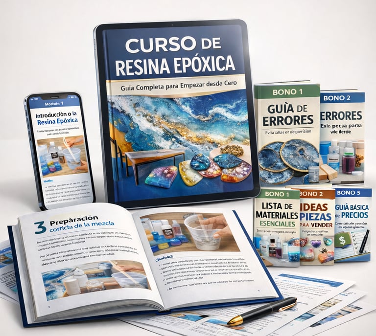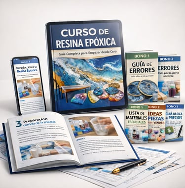 Recibirás el curso completo de Resina Epóxica desde cero, junto con 5 bonos especiales que te ayudarán a elegir materiales, evitar errores, encontrar ideas de piezas para vender, calcular precios y seguir el proceso con más seguridad, todo en formato digital para acceder desde tu celular, tablet o computador.